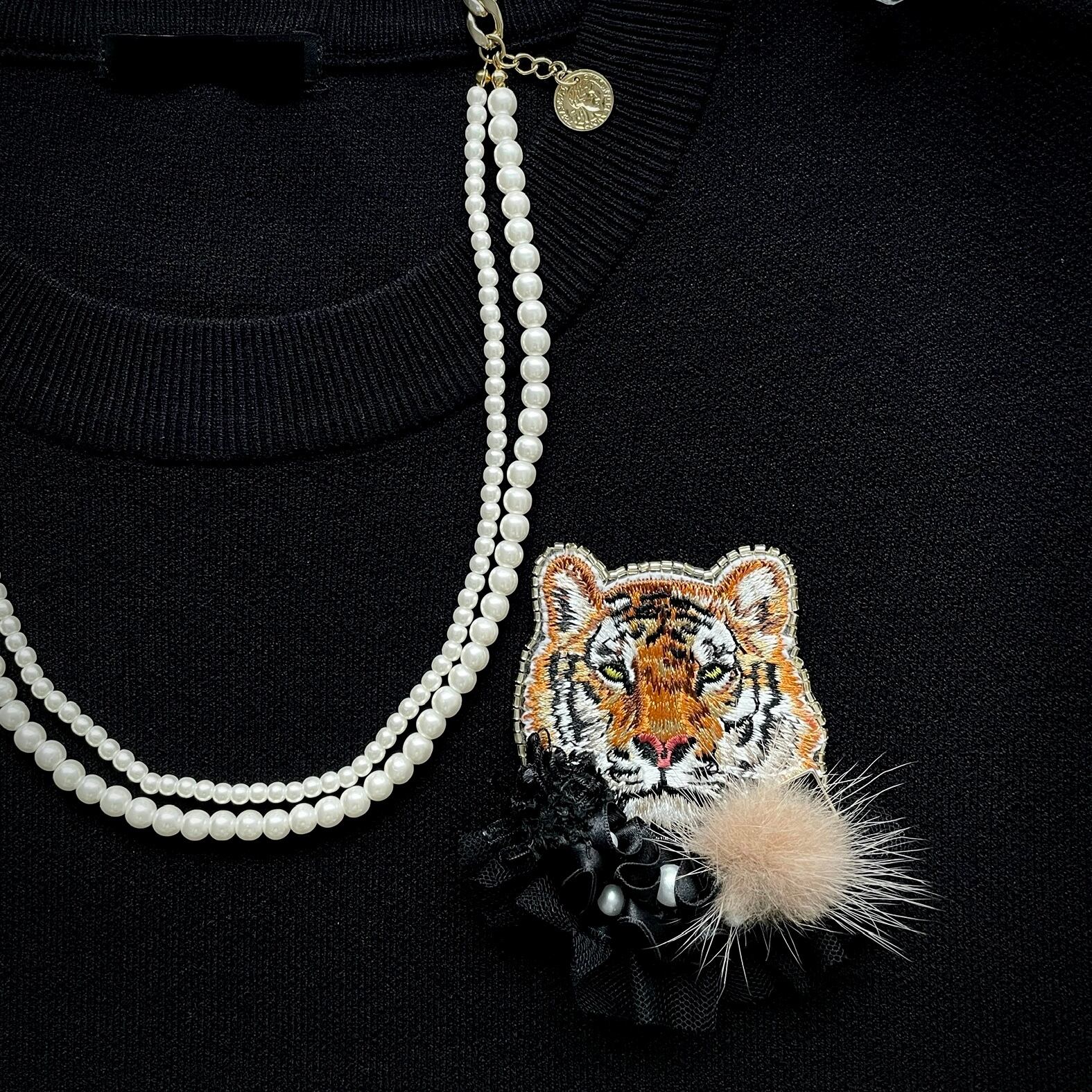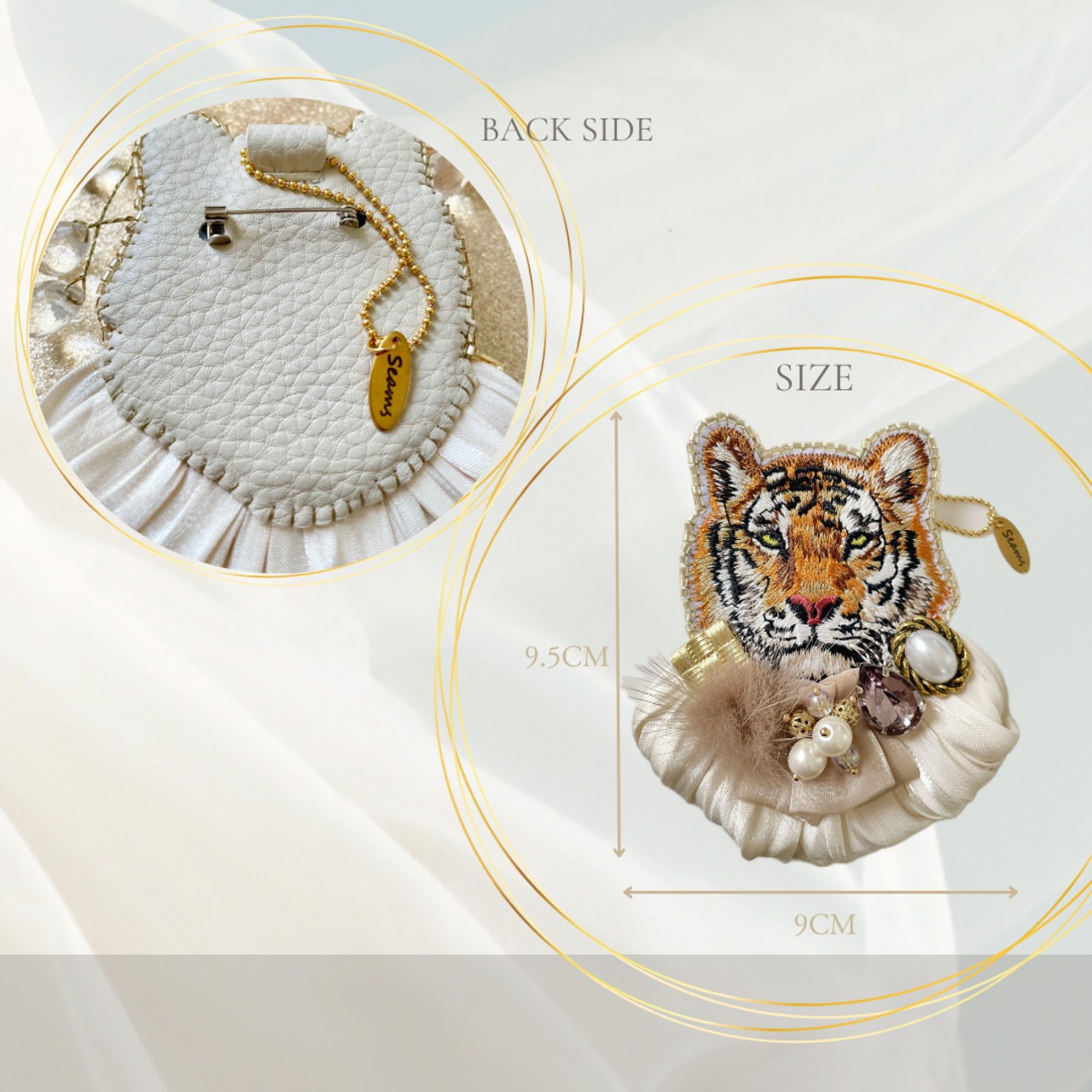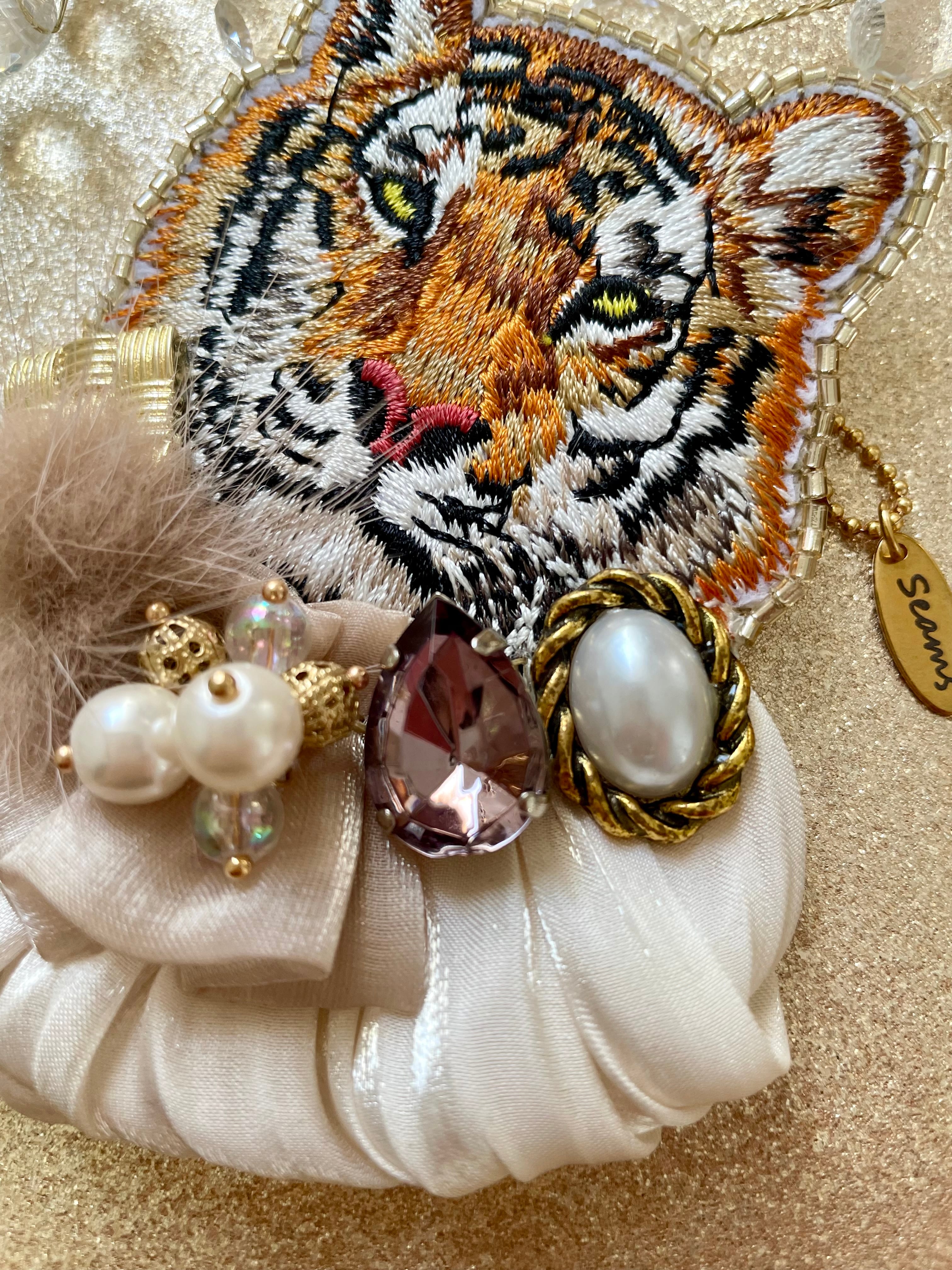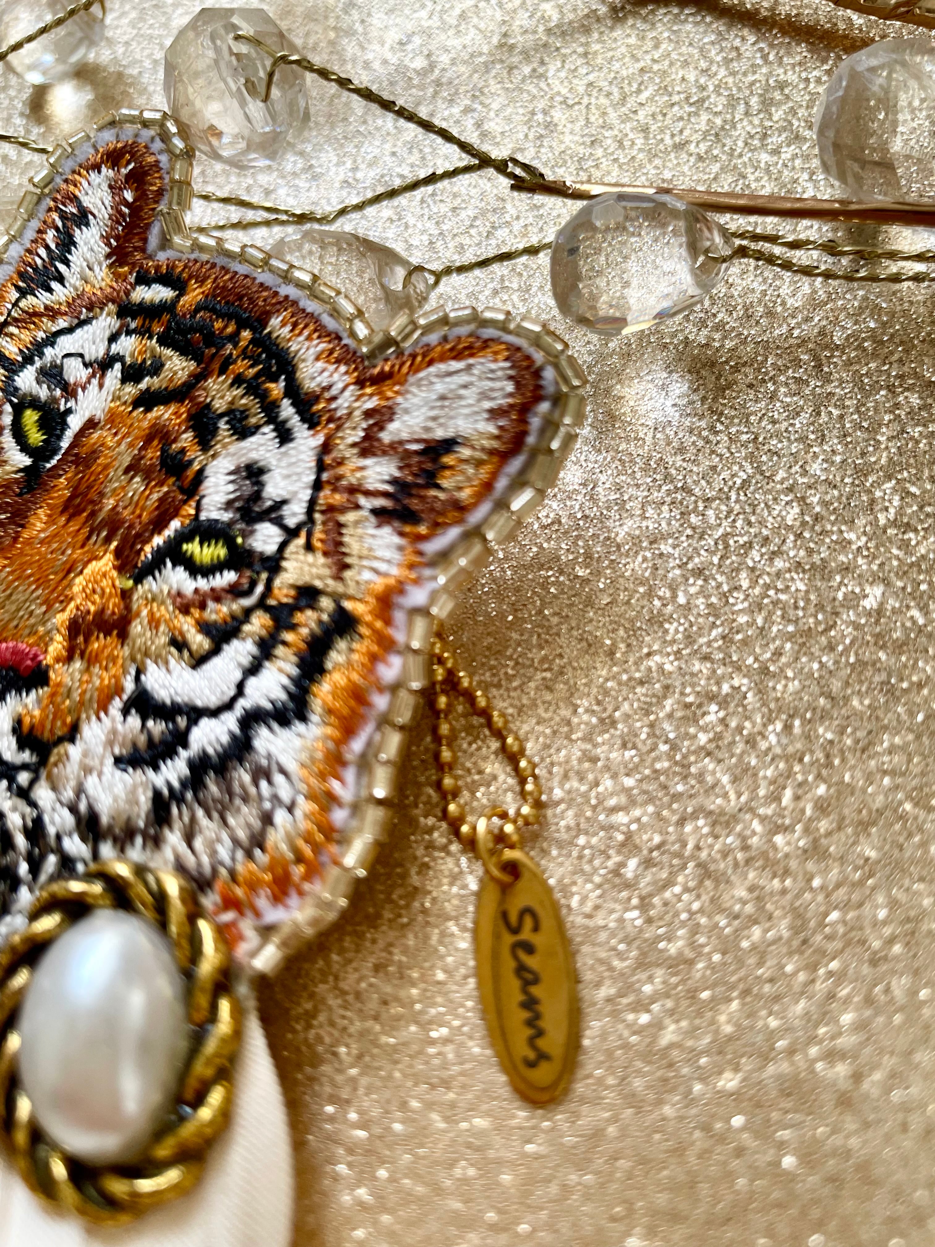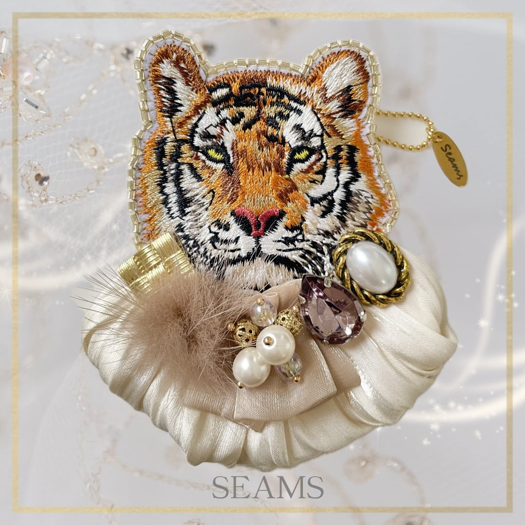 虎モチーフの刺繍に華やかなアイテムを纏わせたSEAMSオリジナルブローチになります。