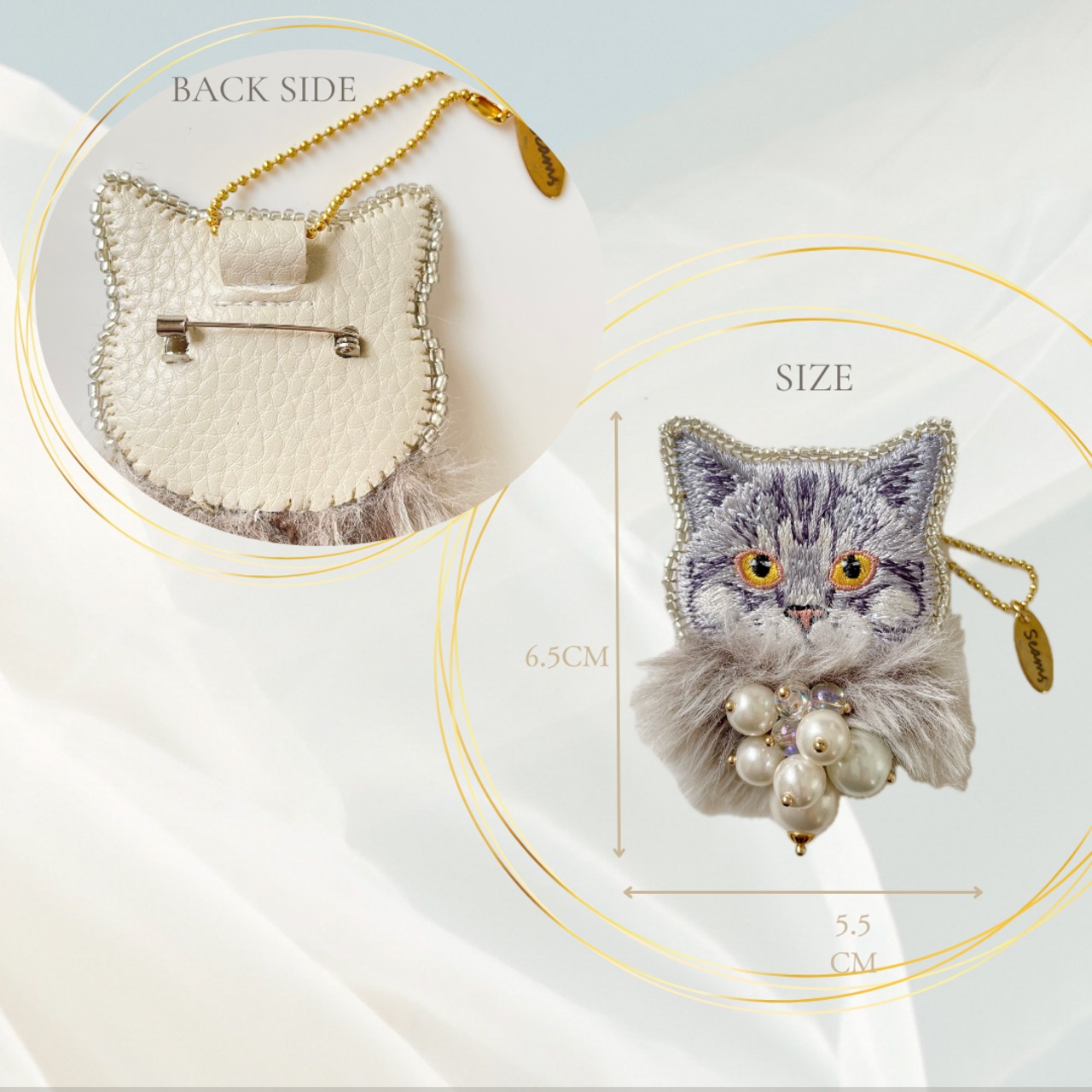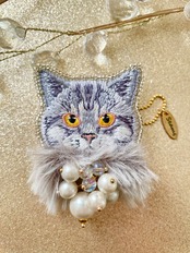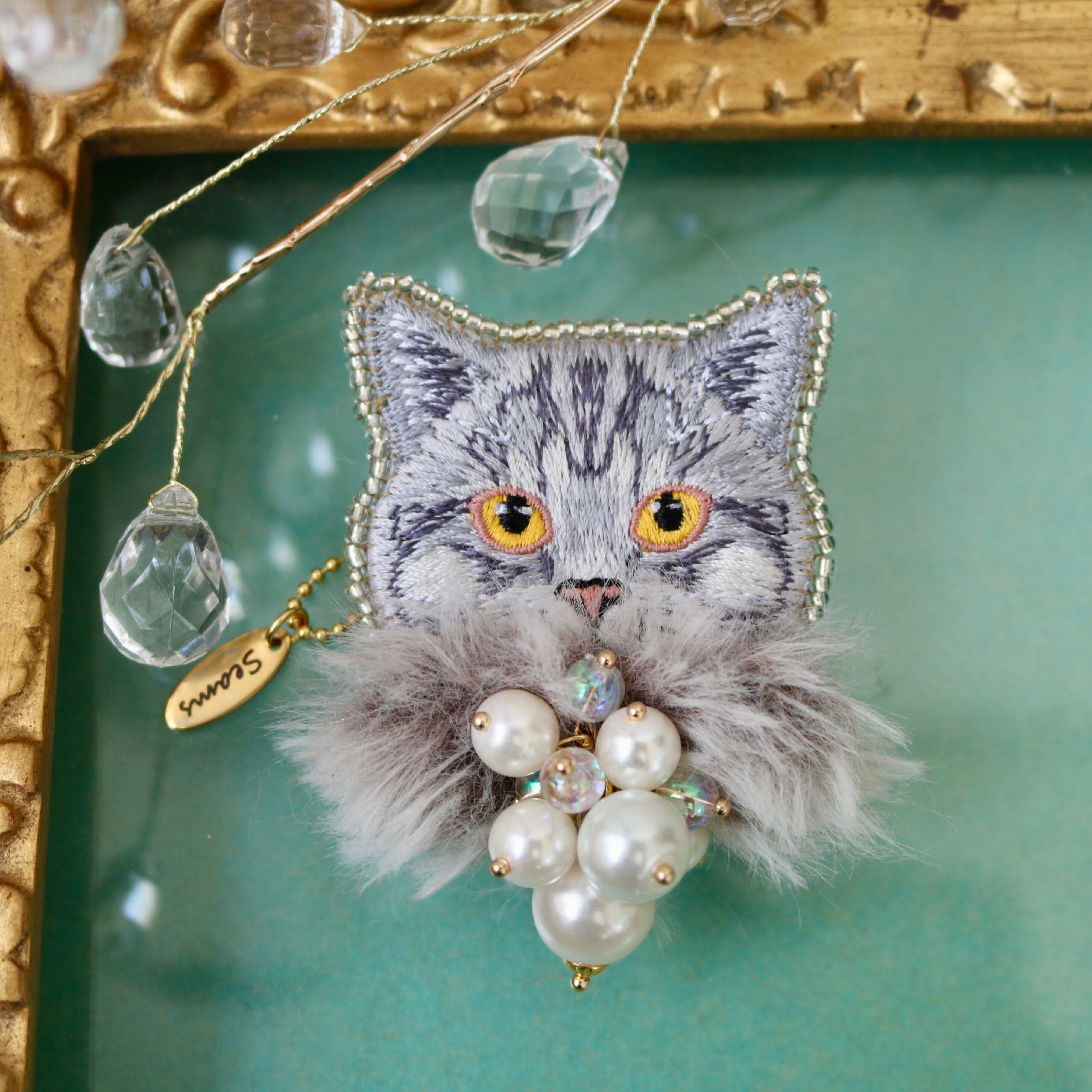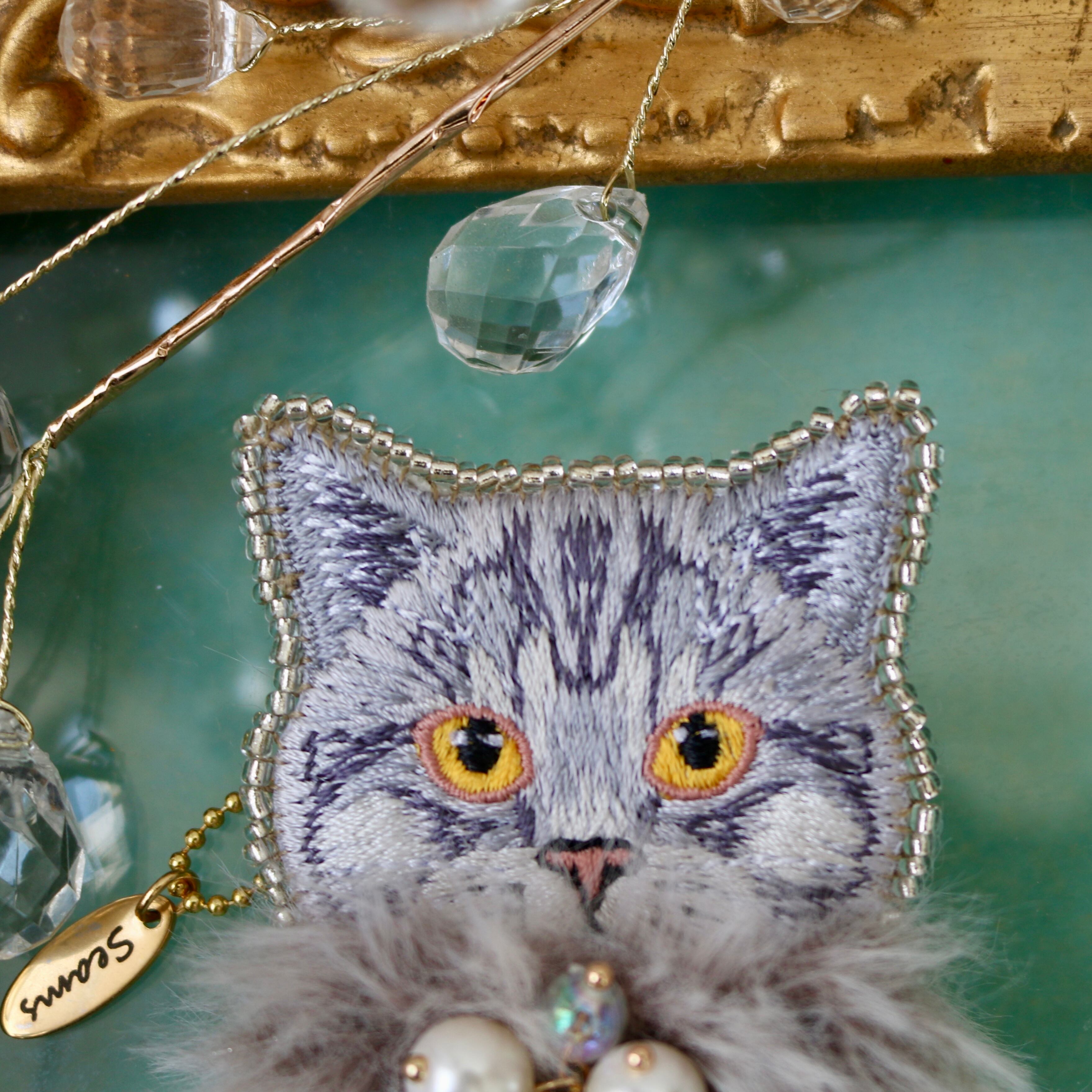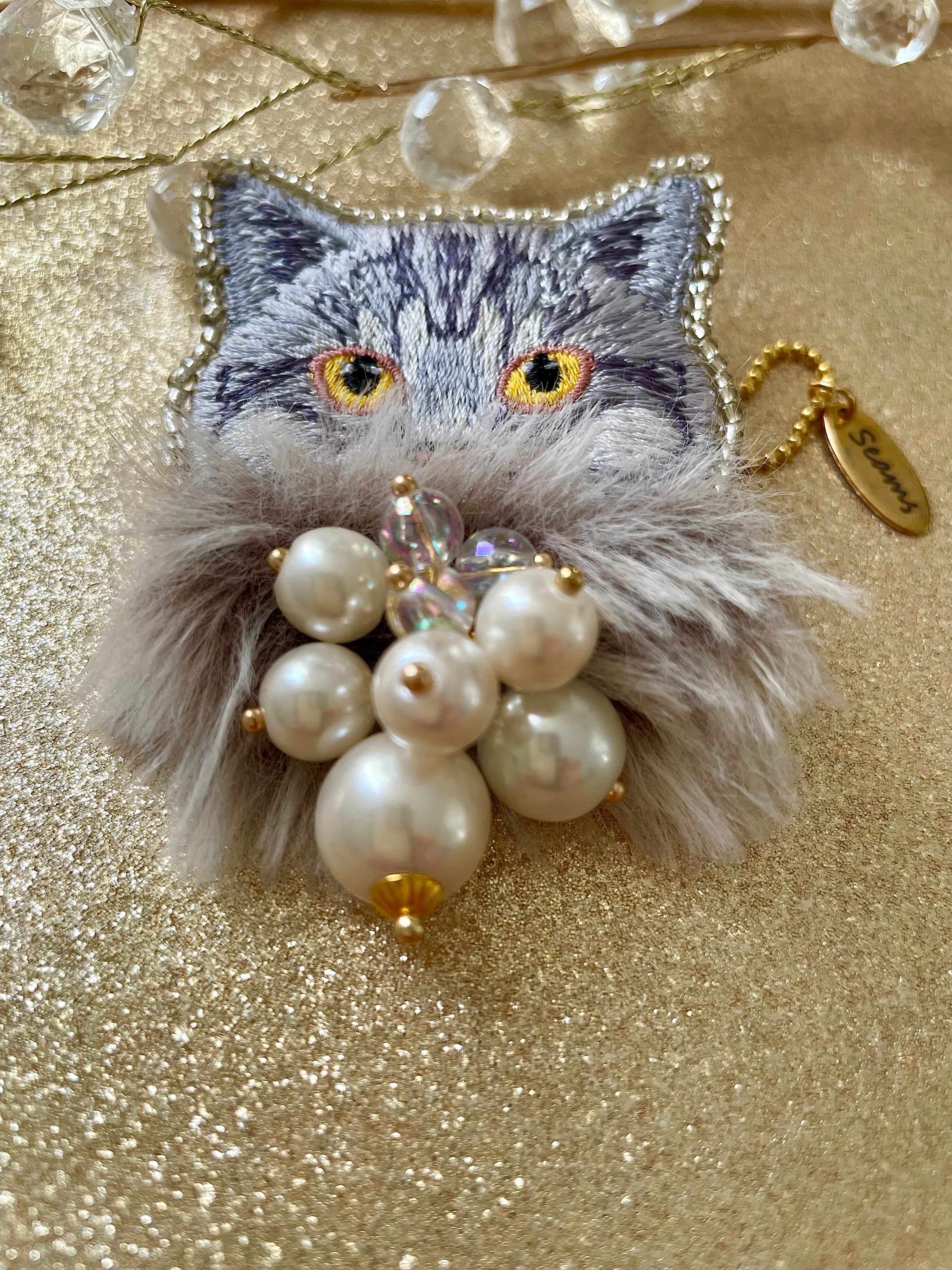 猫モチーフの刺繍に華やかなアイテムを纏わせたSEAMSオリジナルブローチ、キーホルダーになります。