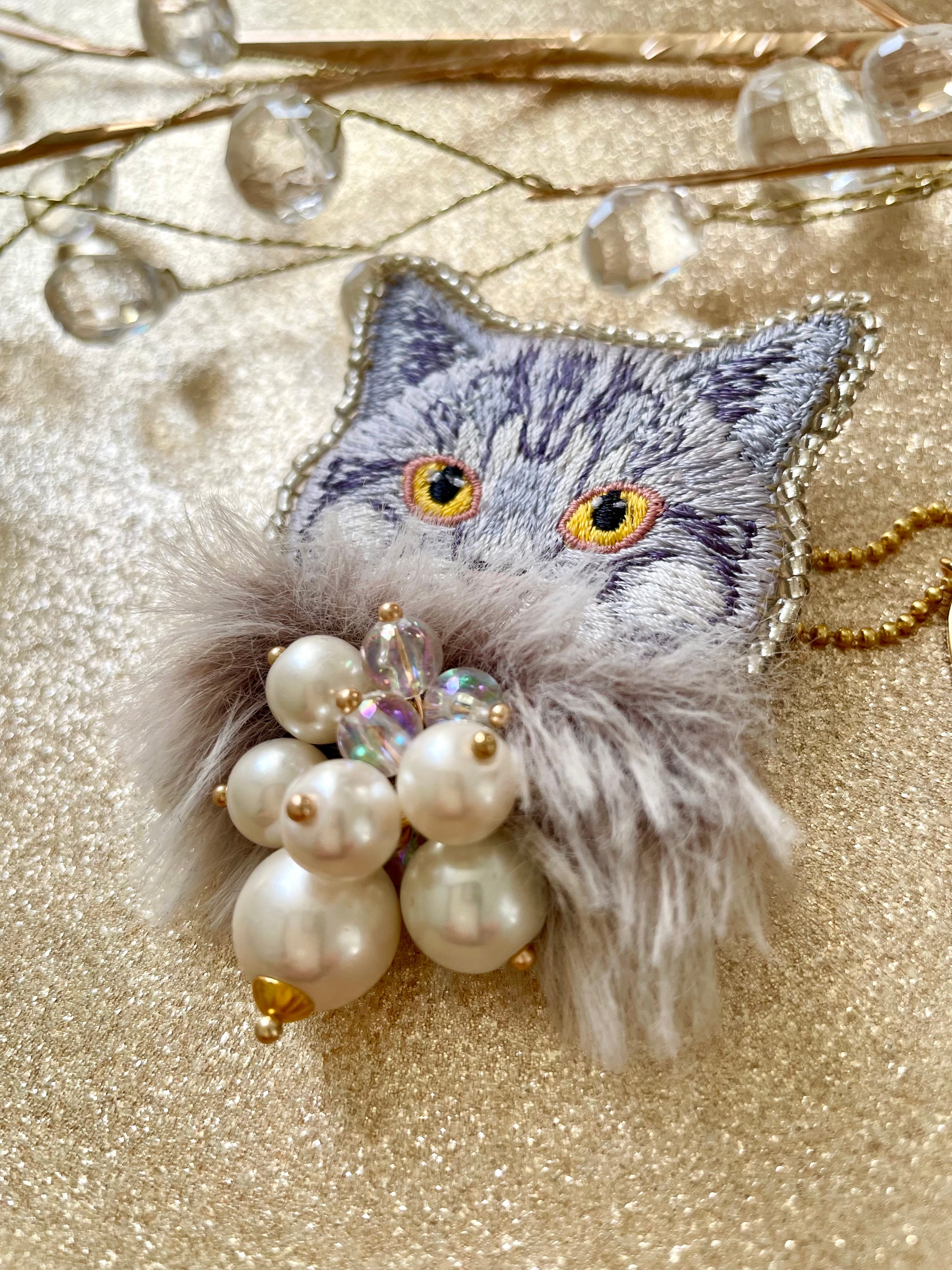 猫さんの華やかデコレーションブローチ キーホルダー 刺繍ブローチ ビーズブローチ