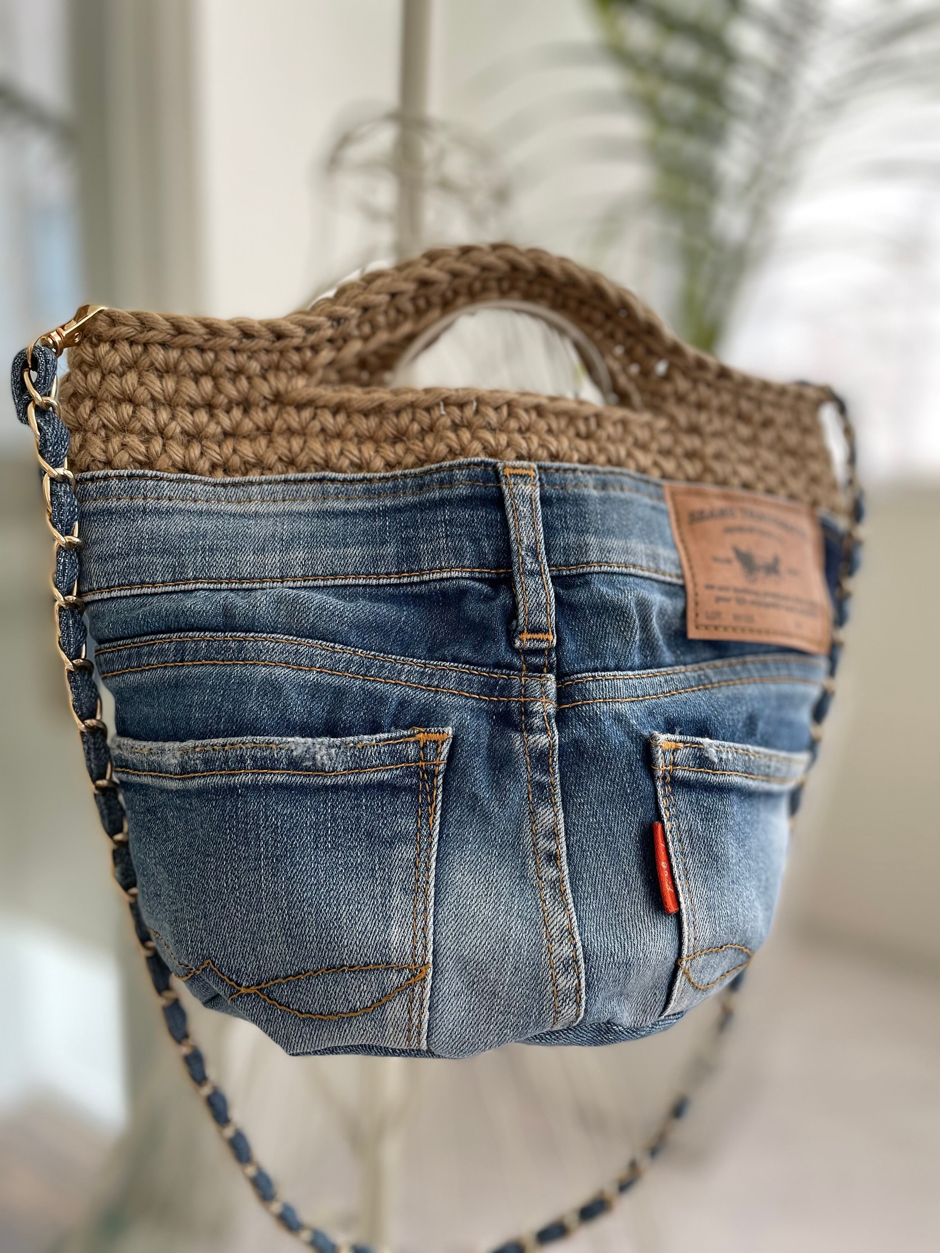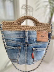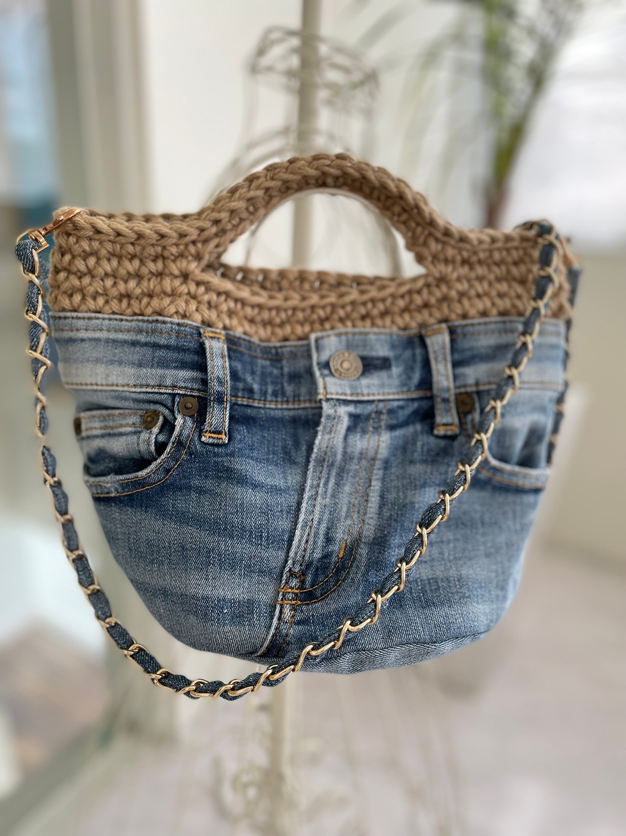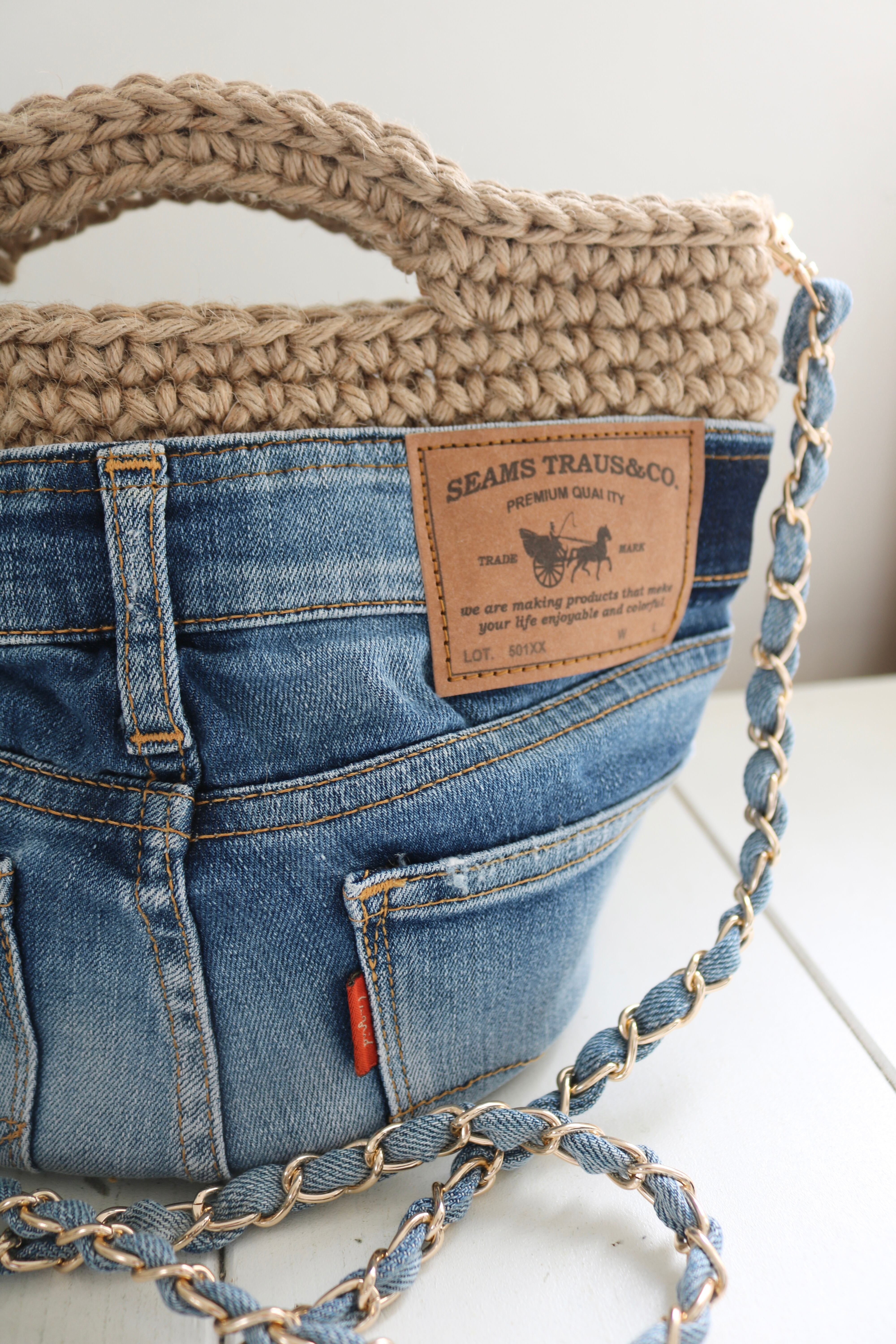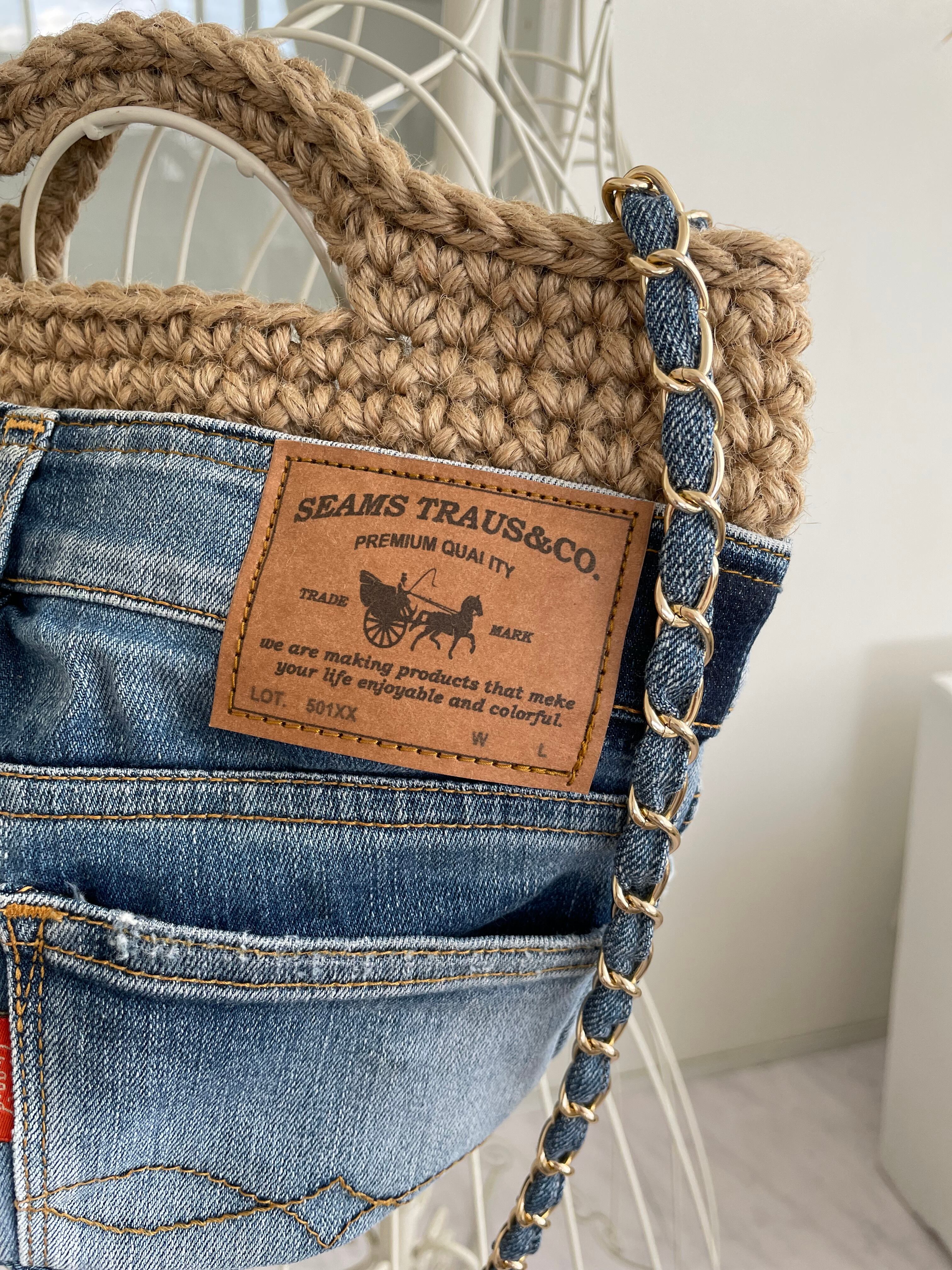 SEAMSオリジナルデザイン 手編みの持ち手つきデニムリメイクバッグ