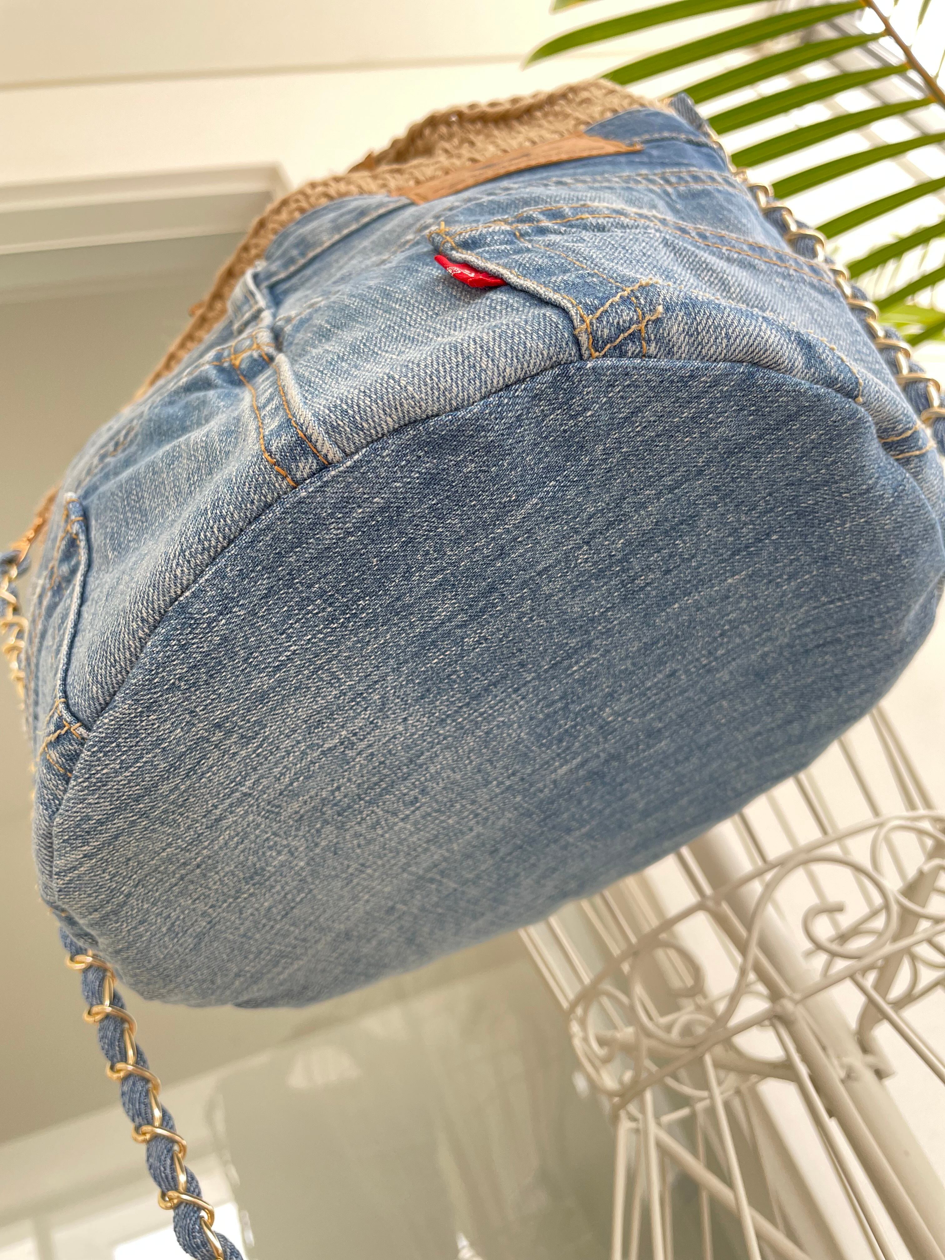 本革を蝋引き糸にてステッチしたハンドルカバーとデニムチェーンストラップもお付けいたします