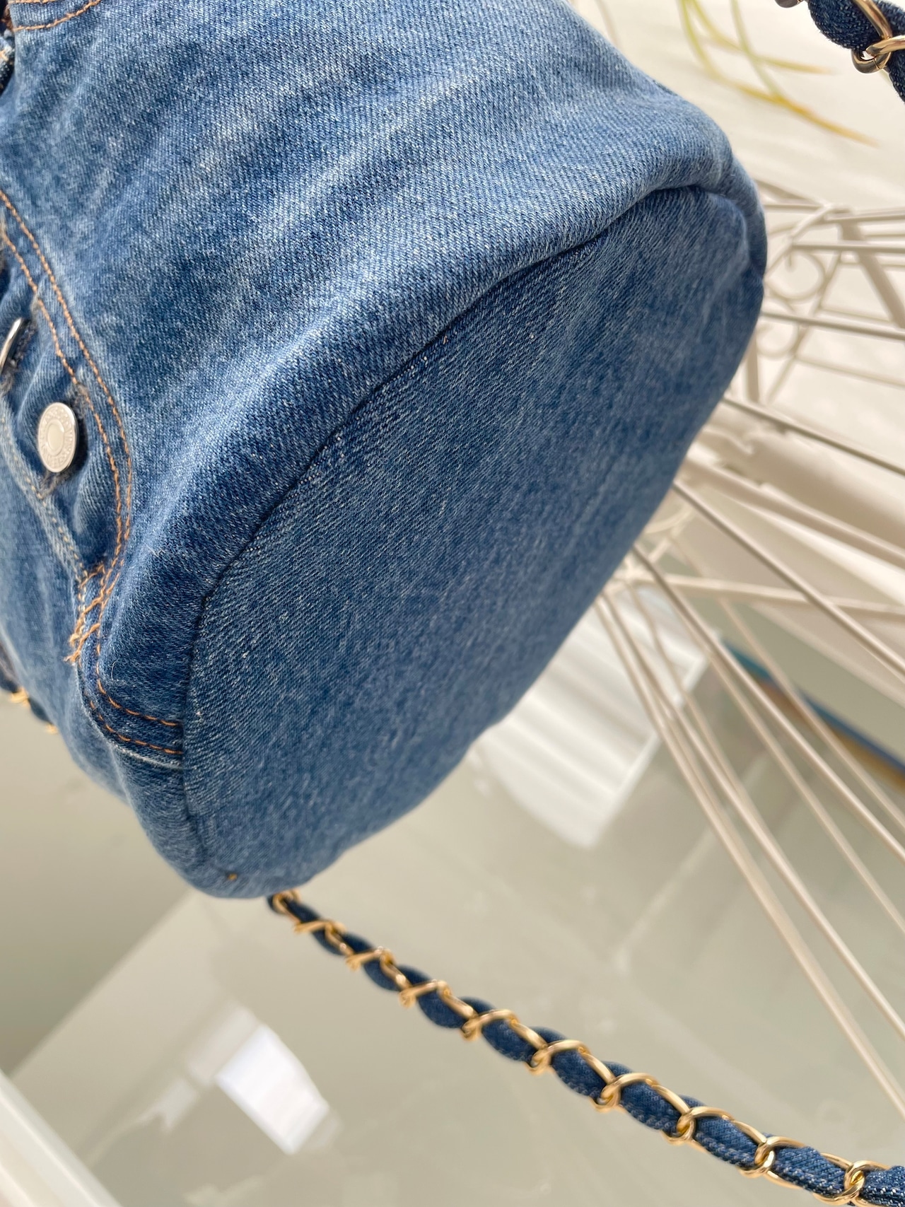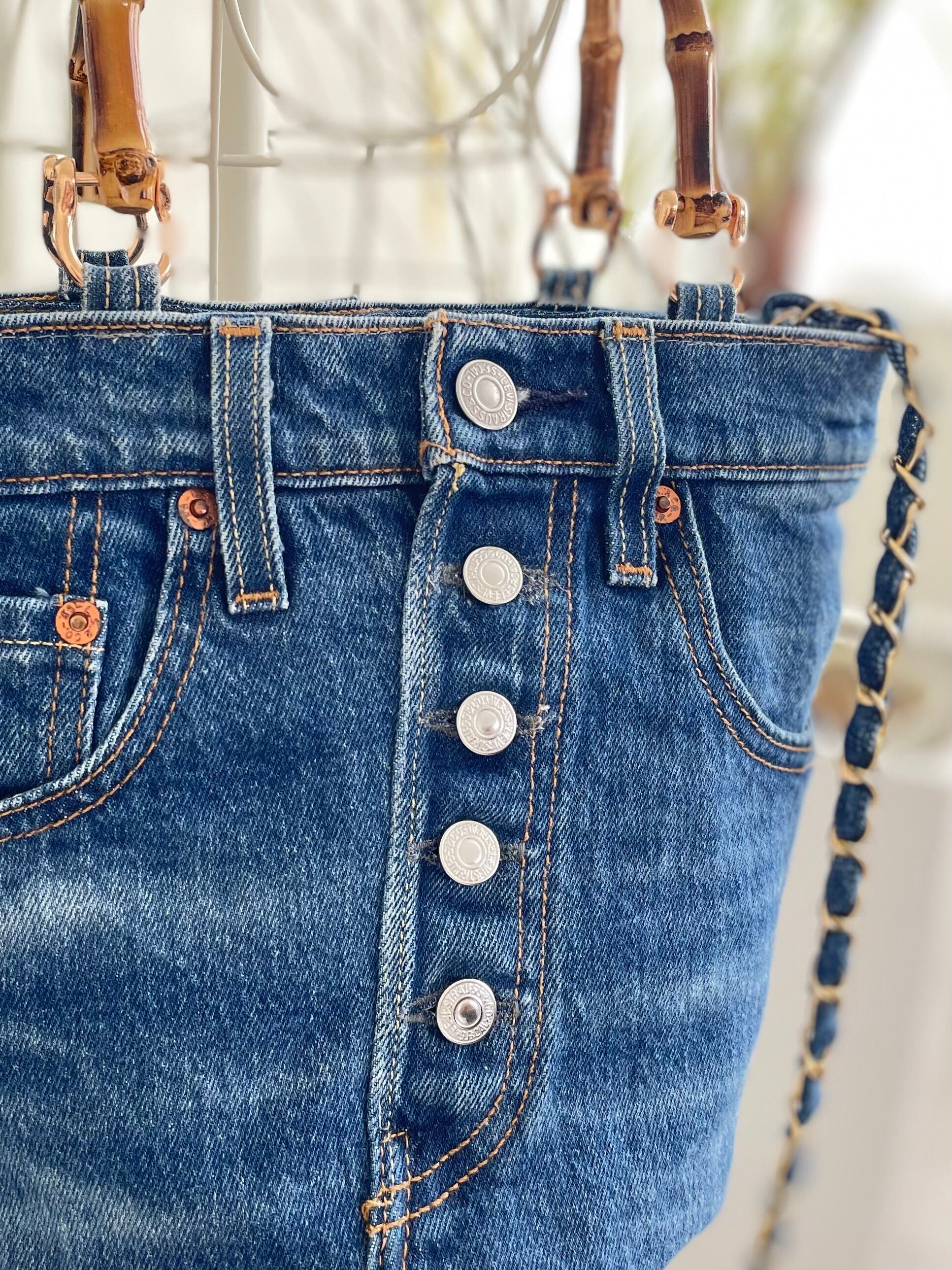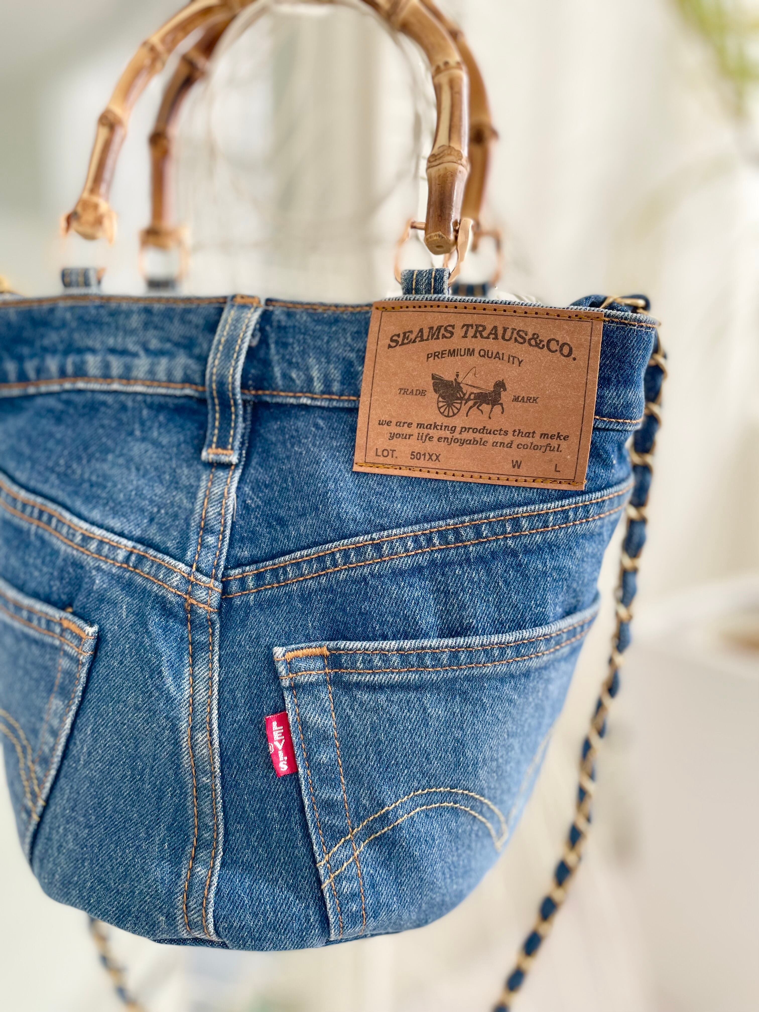 Levi'sデニムリメイクによる 丸底バケツ型バンブートートバッグ